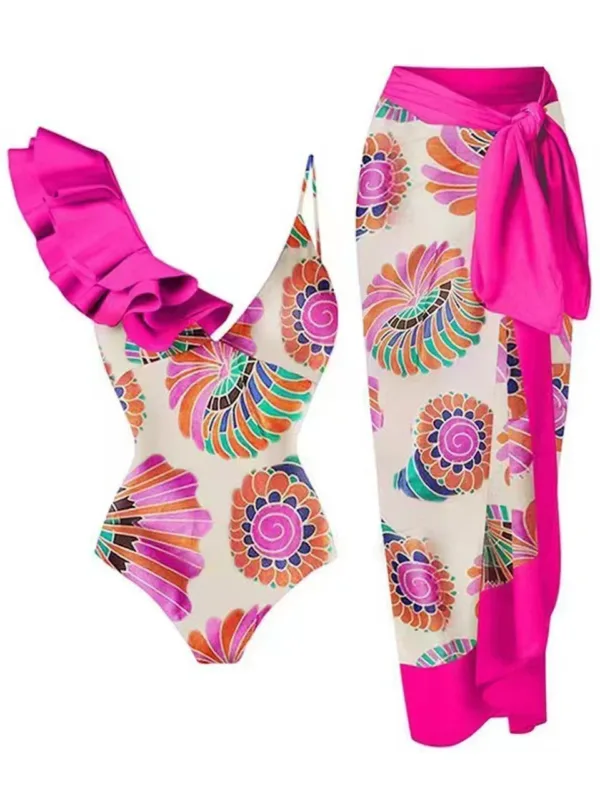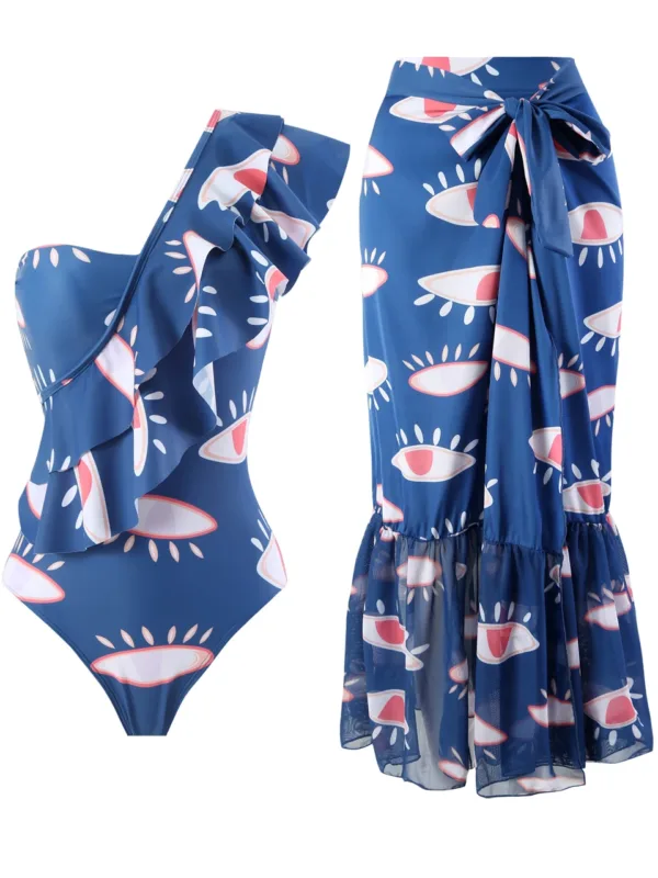 One shoulder Ruffle Bodysuit & Beach Long Skirt Swimsuit 2025 Women New 2 Piece Bikini Set Female Swimming Swimwear Bathing Suit